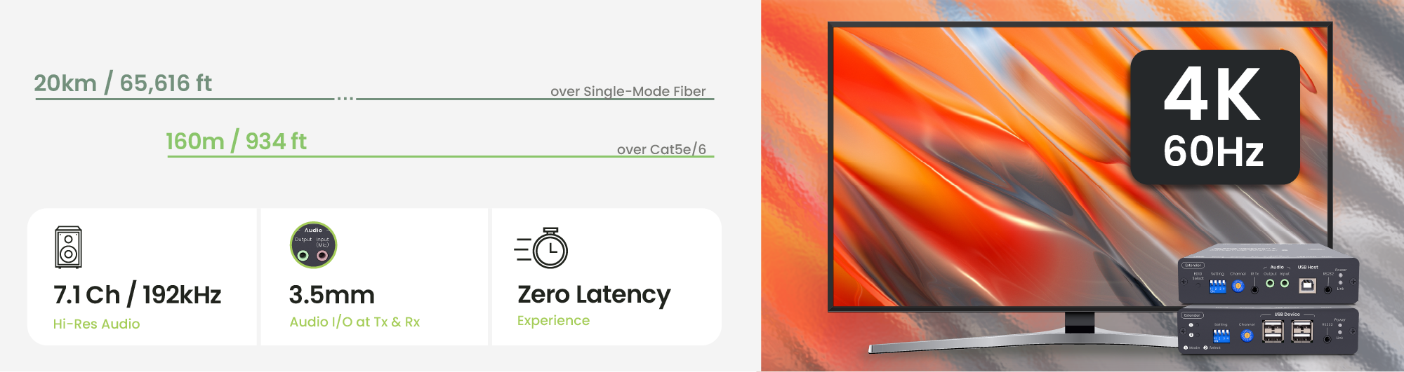 Signal extension up to 160m over CAT5e/CAT6.