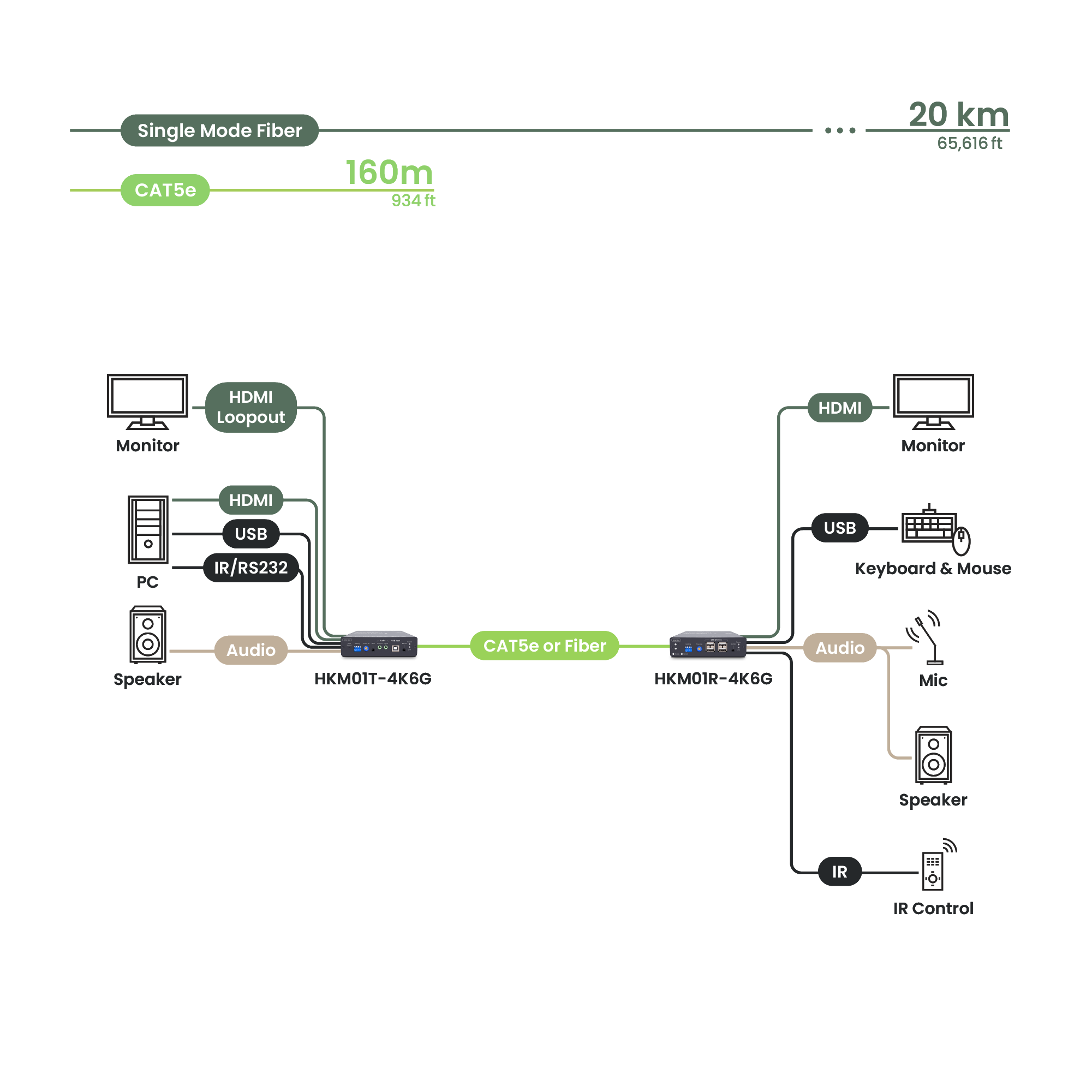 Through rigorous testing, HKM01-4K6G can reach 160m using Cat5e cables and up to 20km using optical fiber modules, catering to various mid to long-range needs.