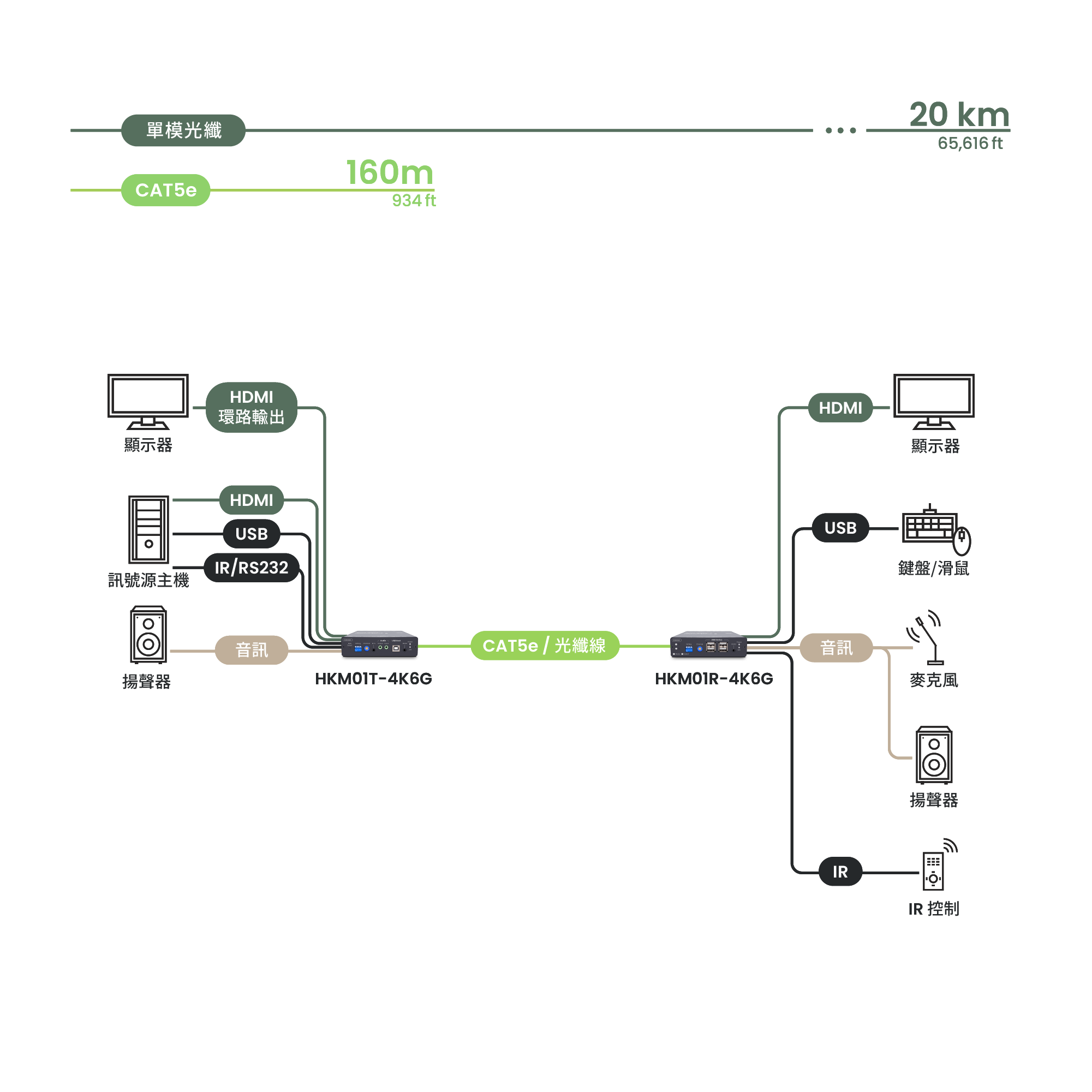 經 SC&T 內部實測,HKM01-4K6G 使用 CAT5e 線材可達 160 公尺。此外,若使用光纖模組傳輸,最遠傳輸距離可達 60 公里,滿足各式中長延伸距離的需求。